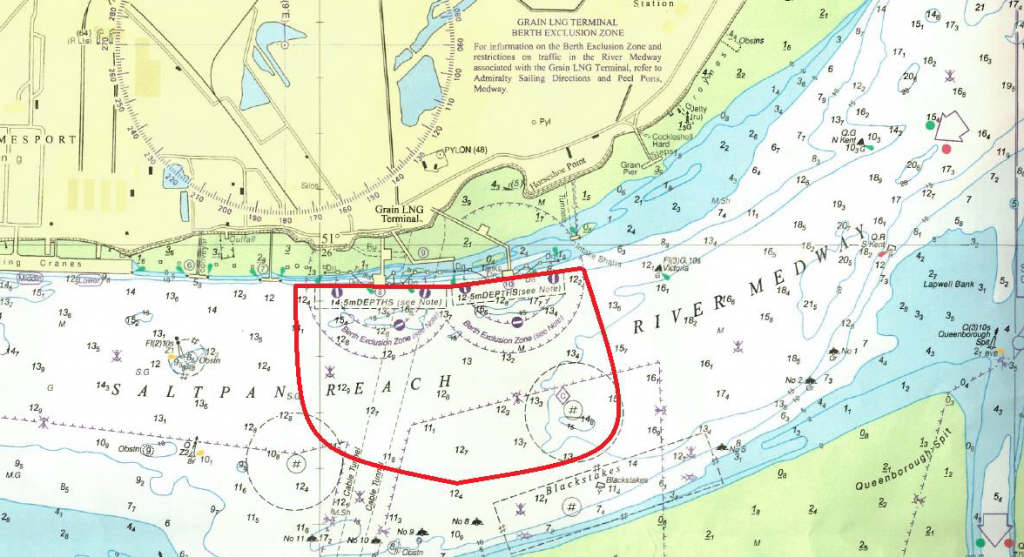 The chart above shows the potential turning circle of an LNG ship and indicates the amount of sea room that needs to be kept clear for the turning manoeuvre. The area highlighted may alter depending on the size of the vessel and if the adjacent LNG berth is occupied by another ship, however, the zone marked is based on the largest LNG vessels expected (345m). When the ship is fast alongside the established LNG berth exclusion zone and associated rules apply to all craft as per Medway NtoM 02 of 2020.