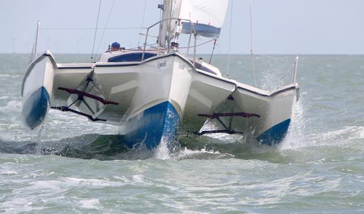 Hoo Ness Yacht Club is unusual on the Medway in having several multhulls in its racing fleet. The photo shows Telstar trimaran Sputnik, skippered by Bryan Wright, taking new club members for an introductory sail.