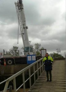 We have been advised by Emma Crompton the Harbour Manager that this morning they have a crane (shore-side) to lift the bridge, then the walkway, so they can re-position the floats. A team has been working through the night fabricating new brackets to go on today which, if all goes to plan, will be welded into place to stop the float coming free again. They have also positioned an additional float to provide extra support to the extremely heavy bridge.