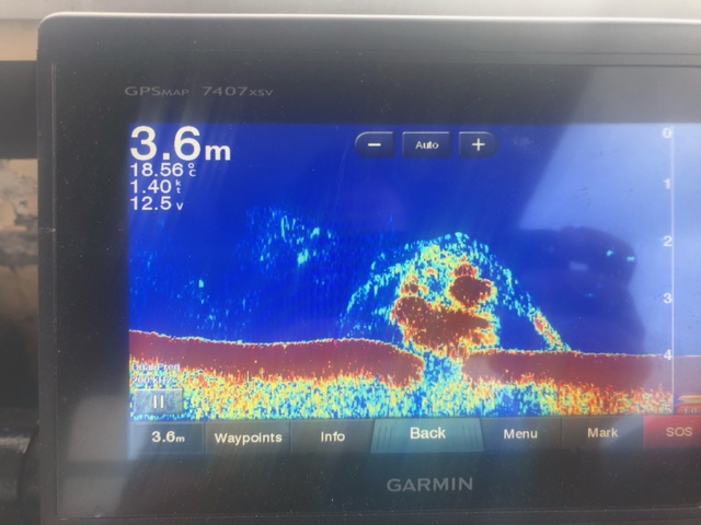 Yesterday Richard heard the metallic clang again, so stopped and did a drift over it, capturing this image on his echo sounder. Peel Ports have been informed but no marker has been put down yet.