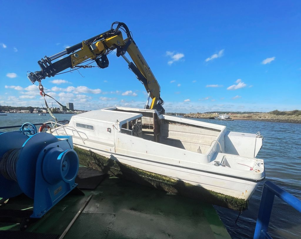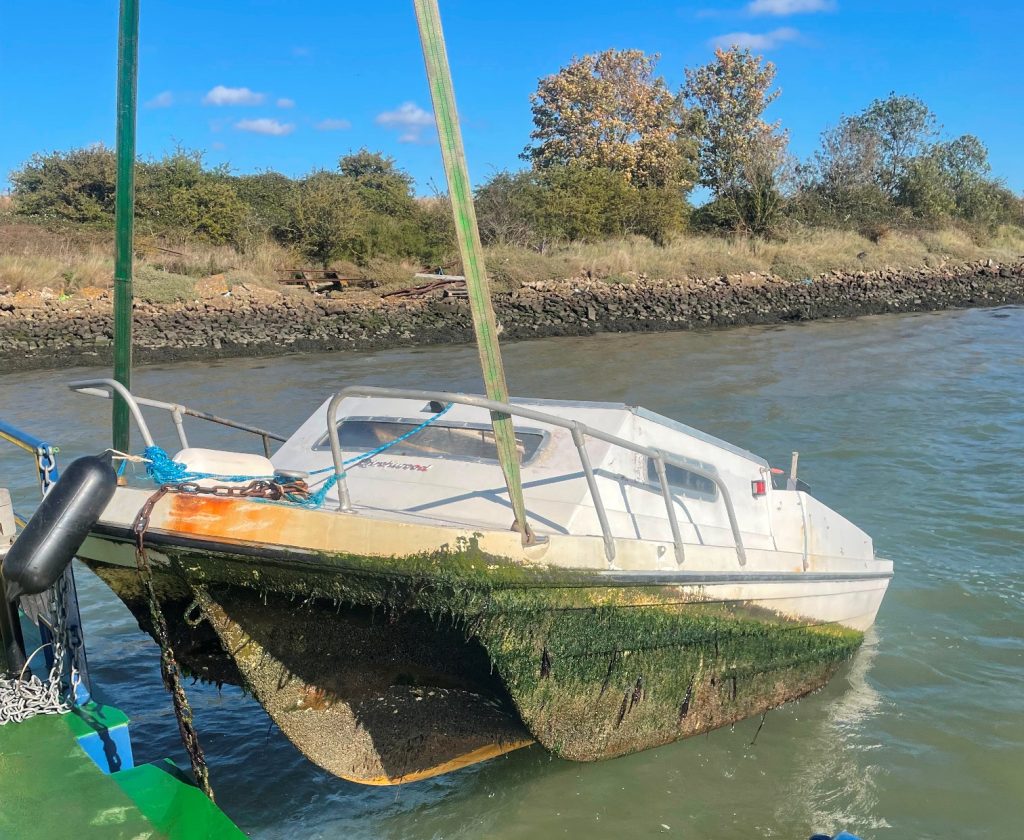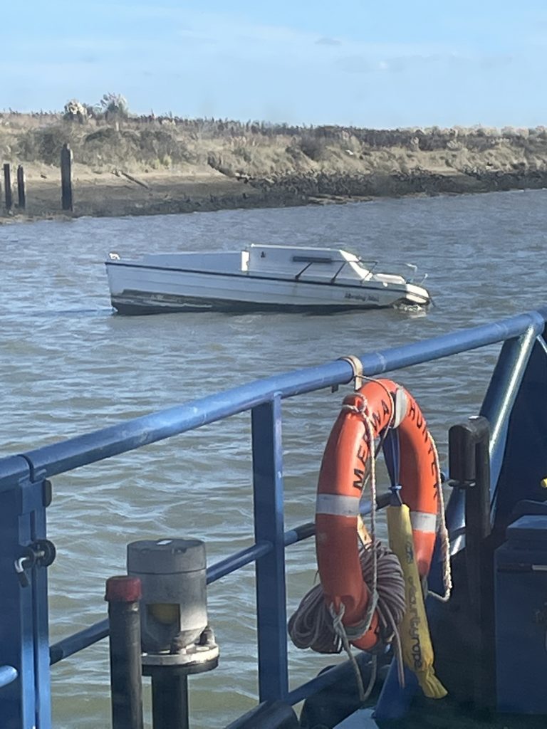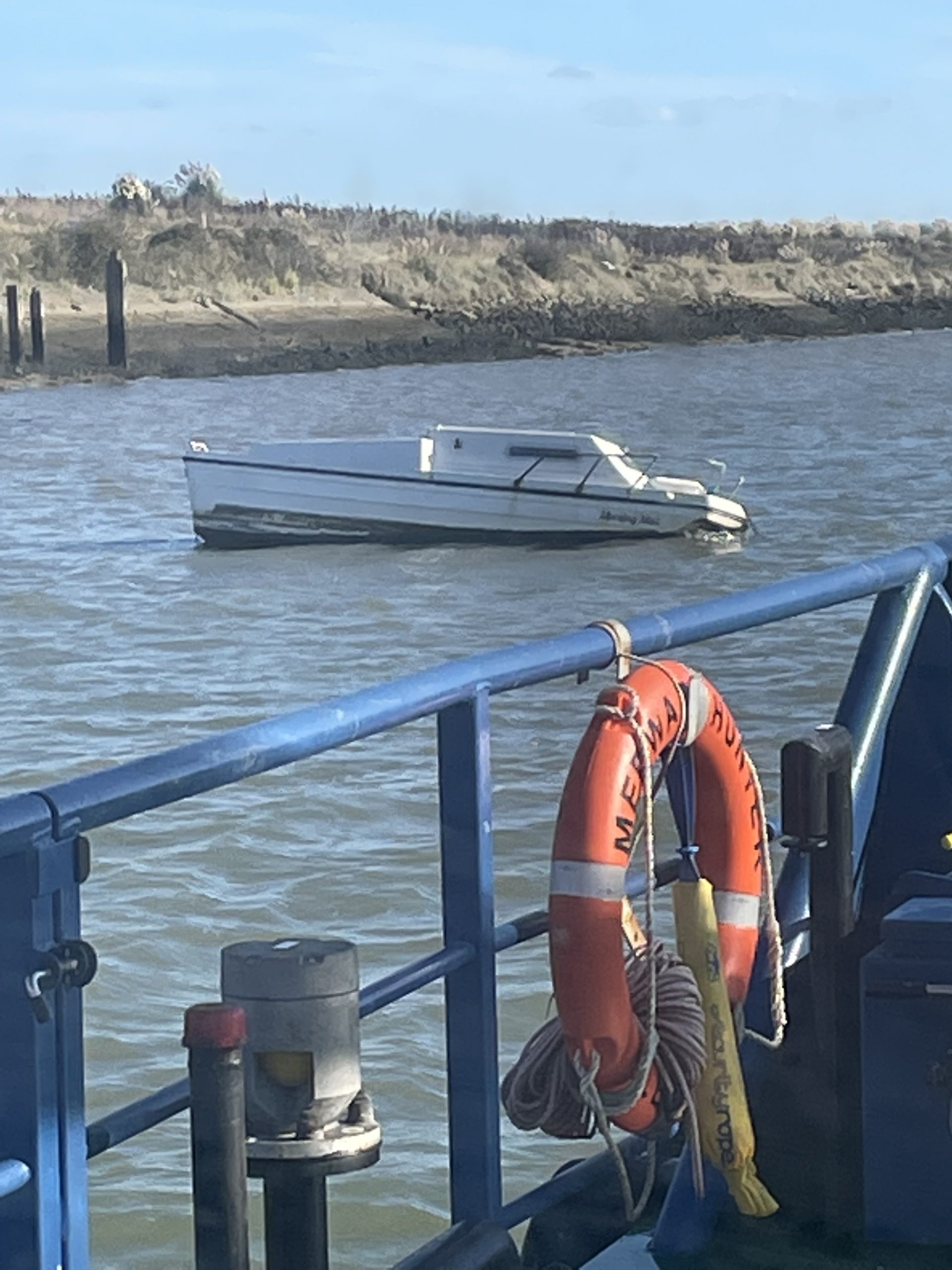 This cathedral-hulled Birchwood 18 called Morning Mist was recovered by Medway Hunter from Gillingham Reach on Sunday after a call from the Coastguard. The neglected but seemingly quite usable boat was part-submerged and had a mooring chain attached to the bow. Peel Ports would like to know where the vessel came from, so if you have any information please contact info@msba.org.uk and we’ll pass it on.