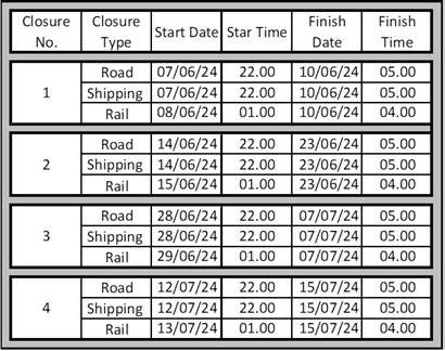 Please note, these are continuous closures and the dates/times shown are proposed start of closure and end of closure.
